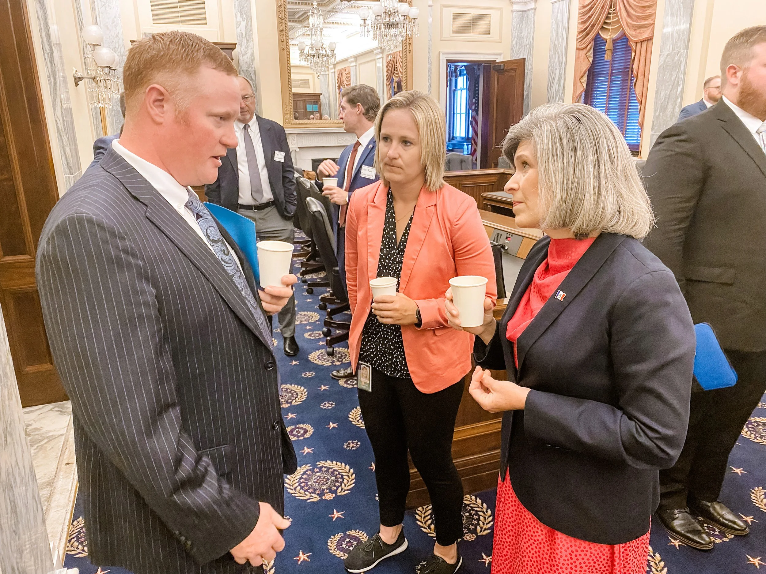 Kevin Knapp, de Larchwood (Iowa), a la izquierda, uno de los tres ganaderos lecheros de AMPI que participaron en el Fly-In de la Midwest Dairy Coalition en el Capitolio, transmite el mensaje de los productos lácteos a Joni Ernst, miembro del Comité de Agricultura del Senado de EE.UU. (Iowa), a la derecha, mientras asiste a su café semanal con los electores. Steph Carlson, la principal asesora agrícola de la senadora, está escuchando.